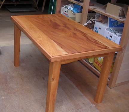 床板の厚さを補うために、周りを枠で補強し、反り止めを兼ねています。板の伸縮による歪みを逃がすために、枠は接着せず、縦横のあわせめは意図的に目違いとしています。
