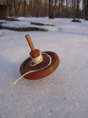 紐を巻き付け、投げて回します。