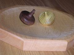 八角形のこま。皿状のこま回し台の上で2つを回すと、